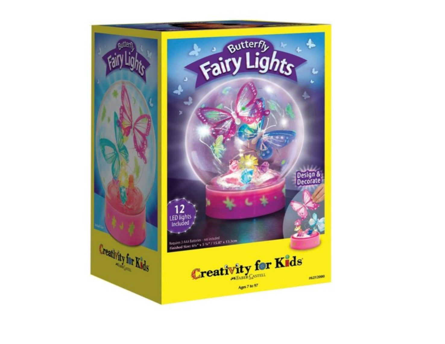 Transform these beautiful contents into an enchanted fairy light with a little crafting magic. Arrange the translucent butterflies, flowers, colourful clay, sparkling gemstones, fairy dust, glitter glue and glow-in-the-dark stickers inside your light-up base and globe. When you're done crafting, twist the globe and decorated base together to seal everything inside. Add the glow stickers to see it light up! 12 strand LED lights operate on 3 AAA batteries (not included).